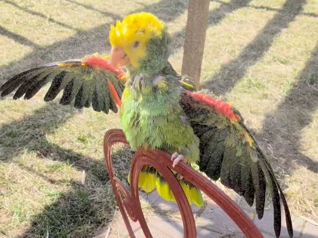 Heidi is a 29 year old DNA sexed female Double Yellow Head. We don’t have a ton of information about her, but we know she’s been handled and is stepping up here okay. She is also very comfortable on a stick if she isn’t used to a person yet. She’s not showing signs of aggression but she is still very timid. She’s never been away from her home and at this time is quite overwhelmed by everything! She is quite sweet and doesn’t look too bad, though she had some minor plucking issues going on when she arrived that have mostly resolved. She’s slowly becoming more vocal and I think she will blossom in the right home… She also discovered the total JOY of baths, as any normal Amazon would, and it’s now a favorite of hers. She likes the aviary, sunshine, pistachios, singing, and whistling the most.